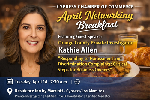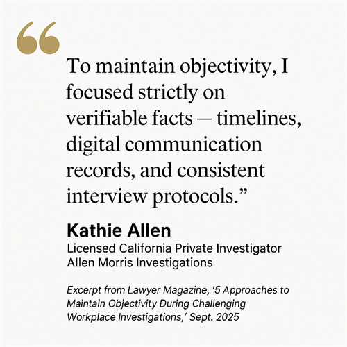 Principal investigator Kathie Allen is a Licensed California Private Investigator, Certified Title IX Investigator, Certified Mediator, and SHRM-SCP with over 20 years of combined HR and investigative experience. She understands both the legal landscape and the human dynamics of workplace investigations.